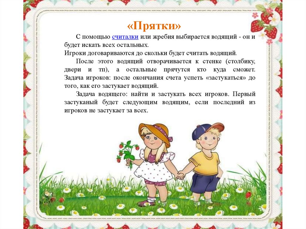 «Прятки»С помощью считалки или жребия выбирается водящий - он и