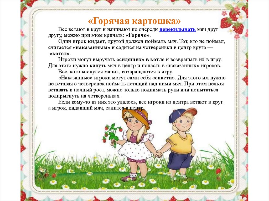 «Горячая картошка»Все встают в круг и начинают по очереди перекидывать мяч друг