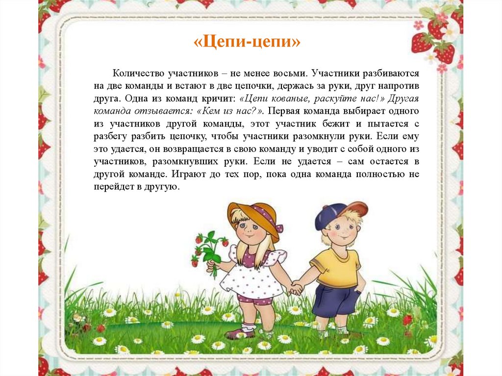 «Цепи-цепи»Количество участников – не менее восьми. Участники разбиваются