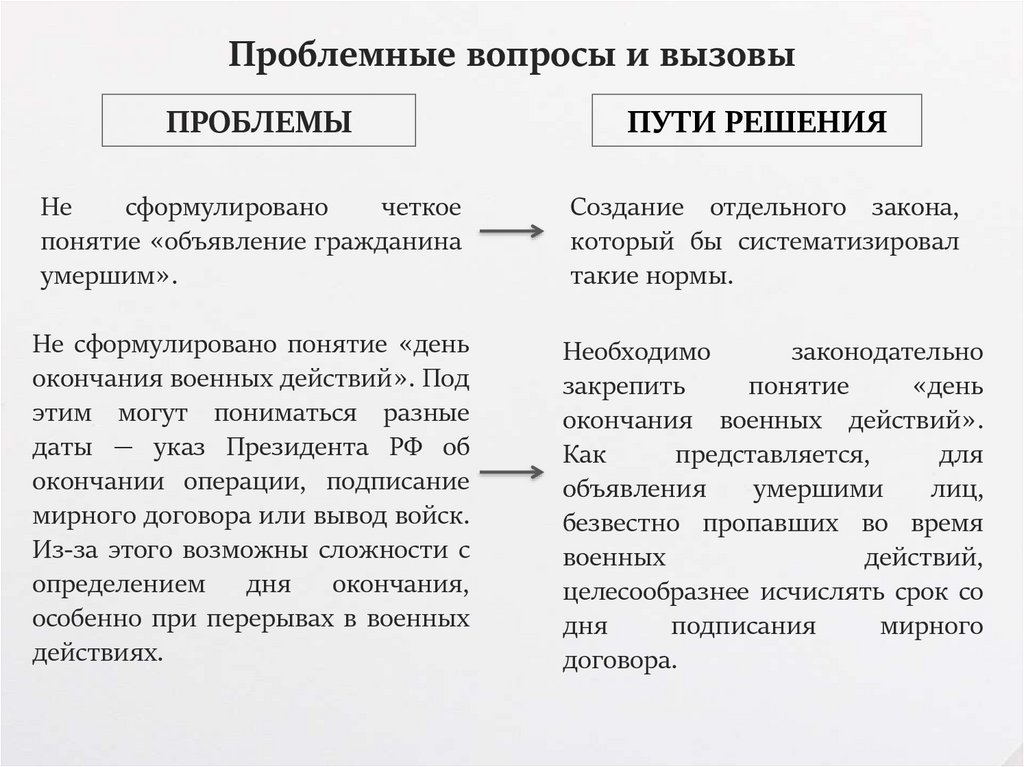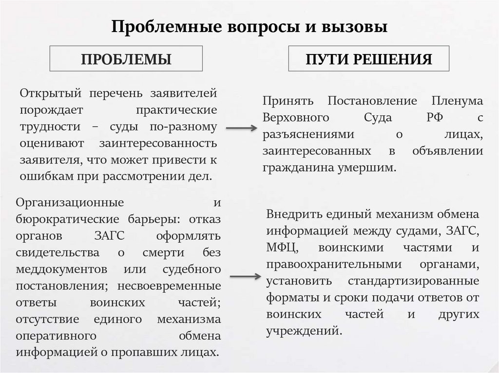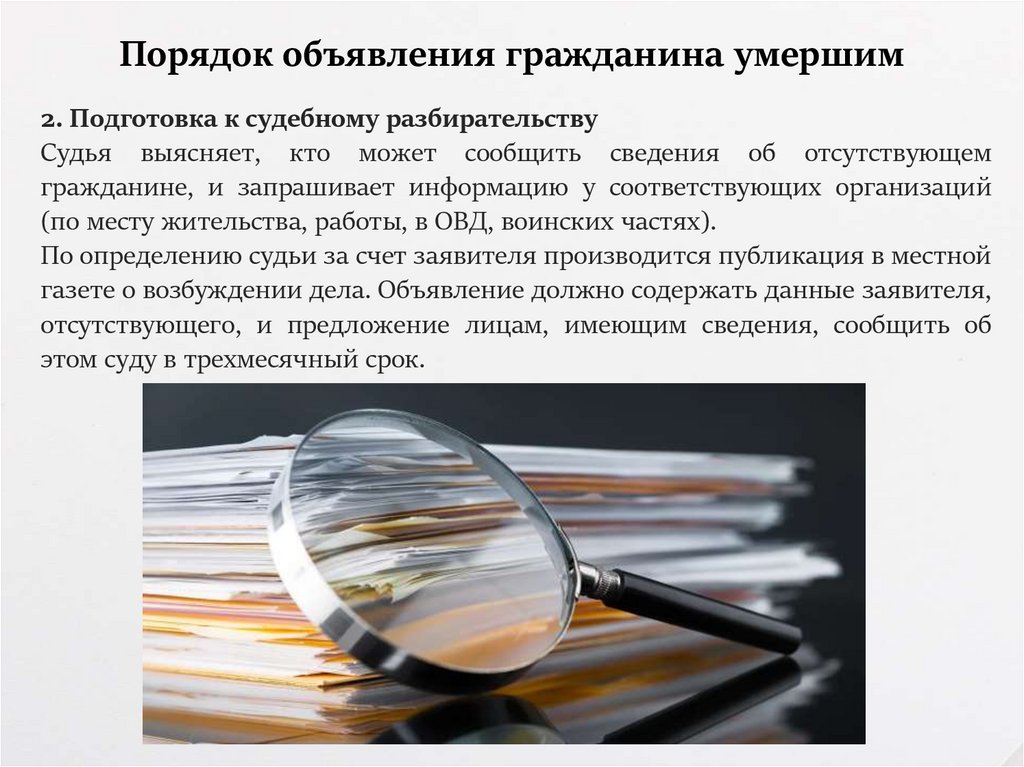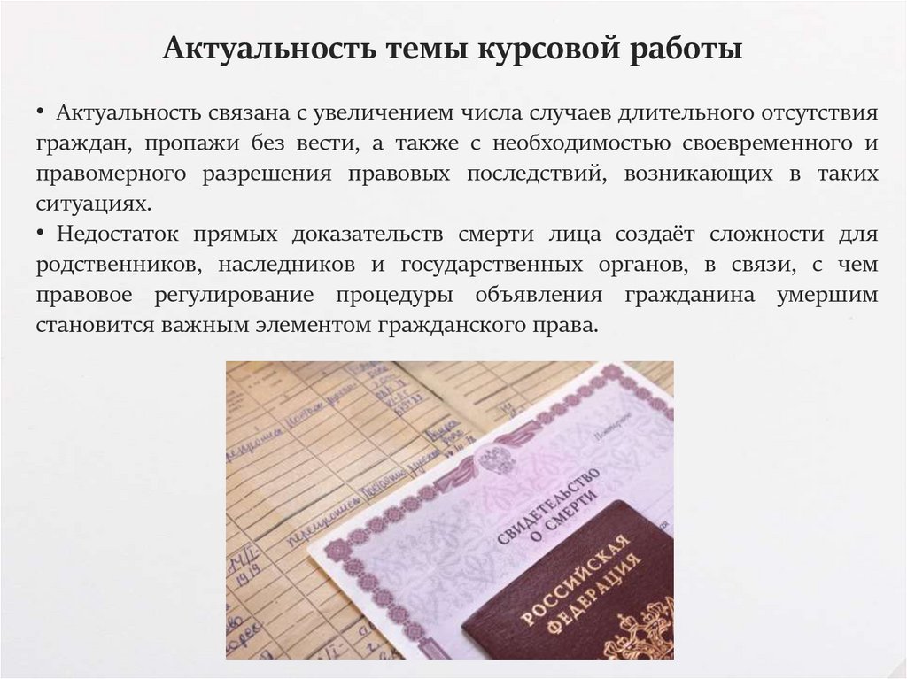 • Недостаток прямых доказательств смерти лица создаёт сложности для