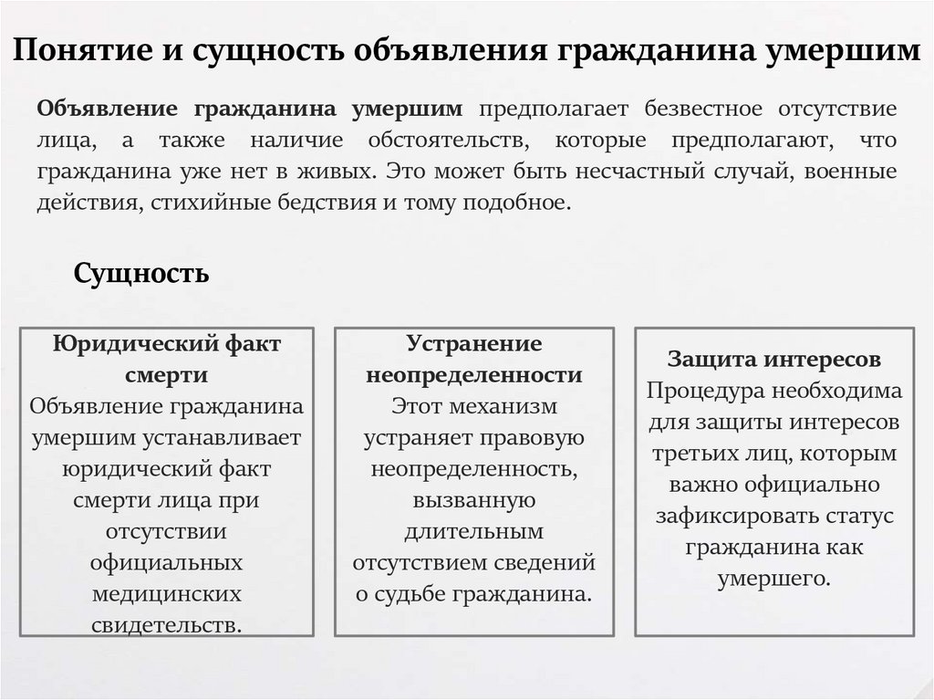 Понятие и сущность объявления гражданина умершимОбъявление гражданина умершим предполагает безвестное отсутствие