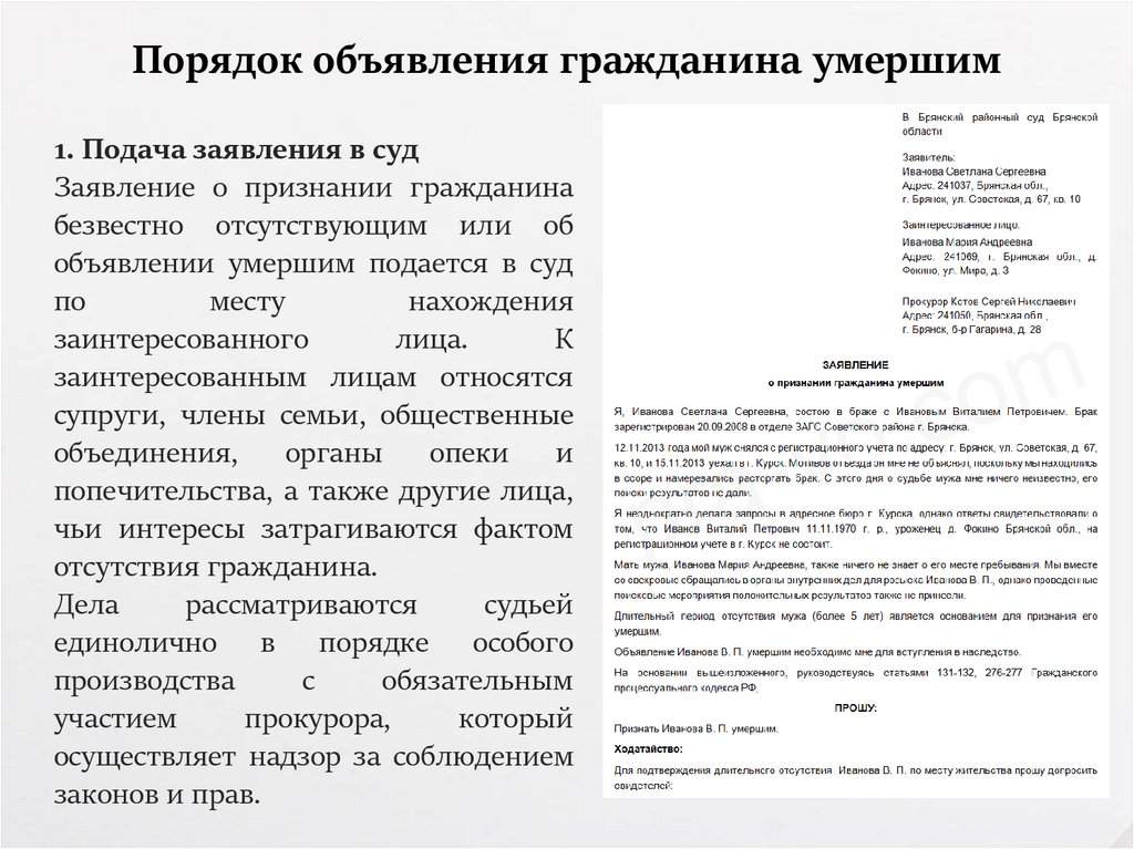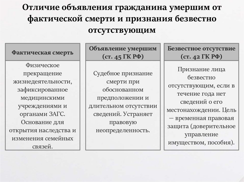 Отличие объявления гражданина умершим отфактической смерти и признания безвестно