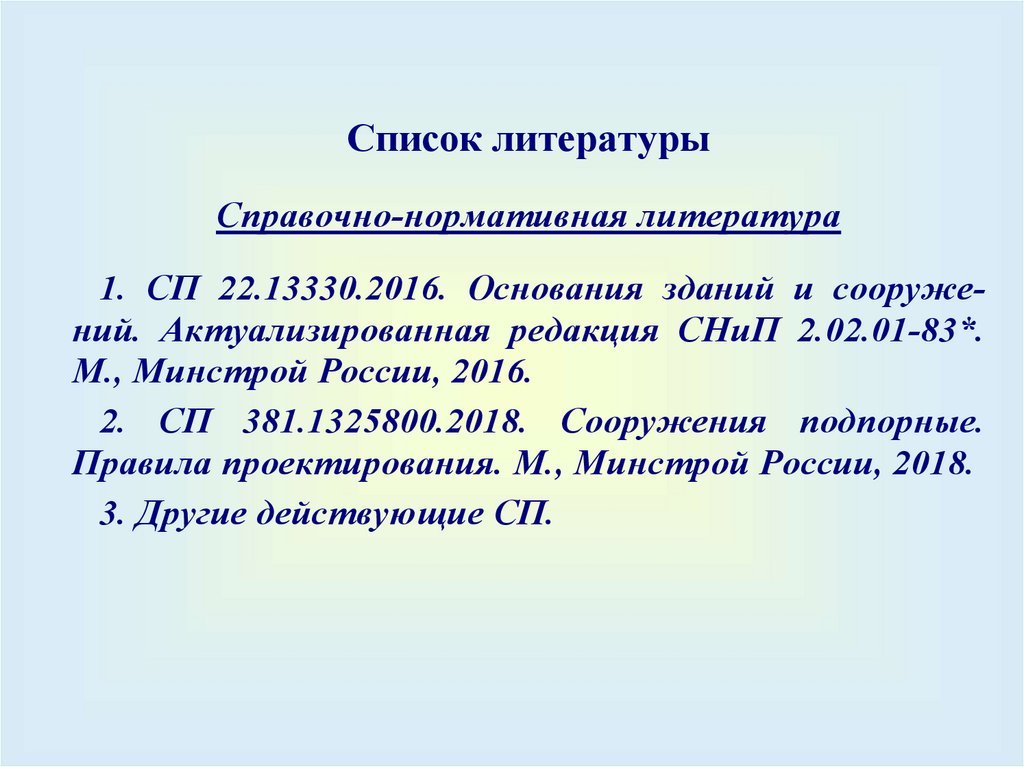 1. СП 22.13330.2016. Основания зданий и сооружений. Актуализированная редакция СНиП 2.02.01-83*.