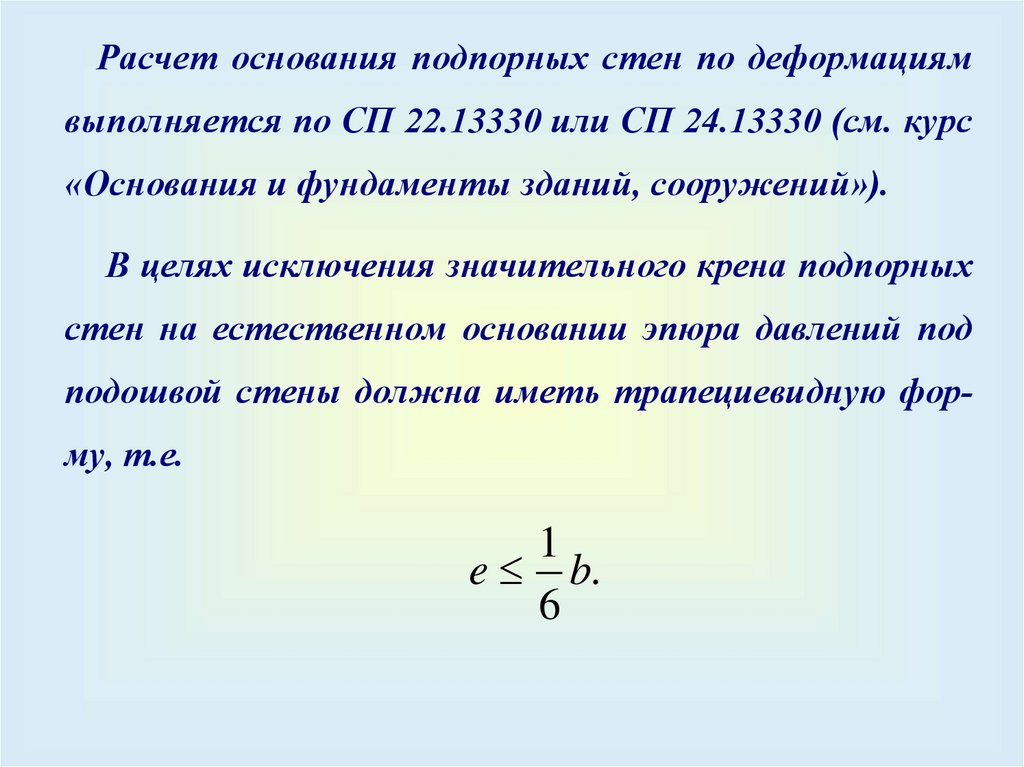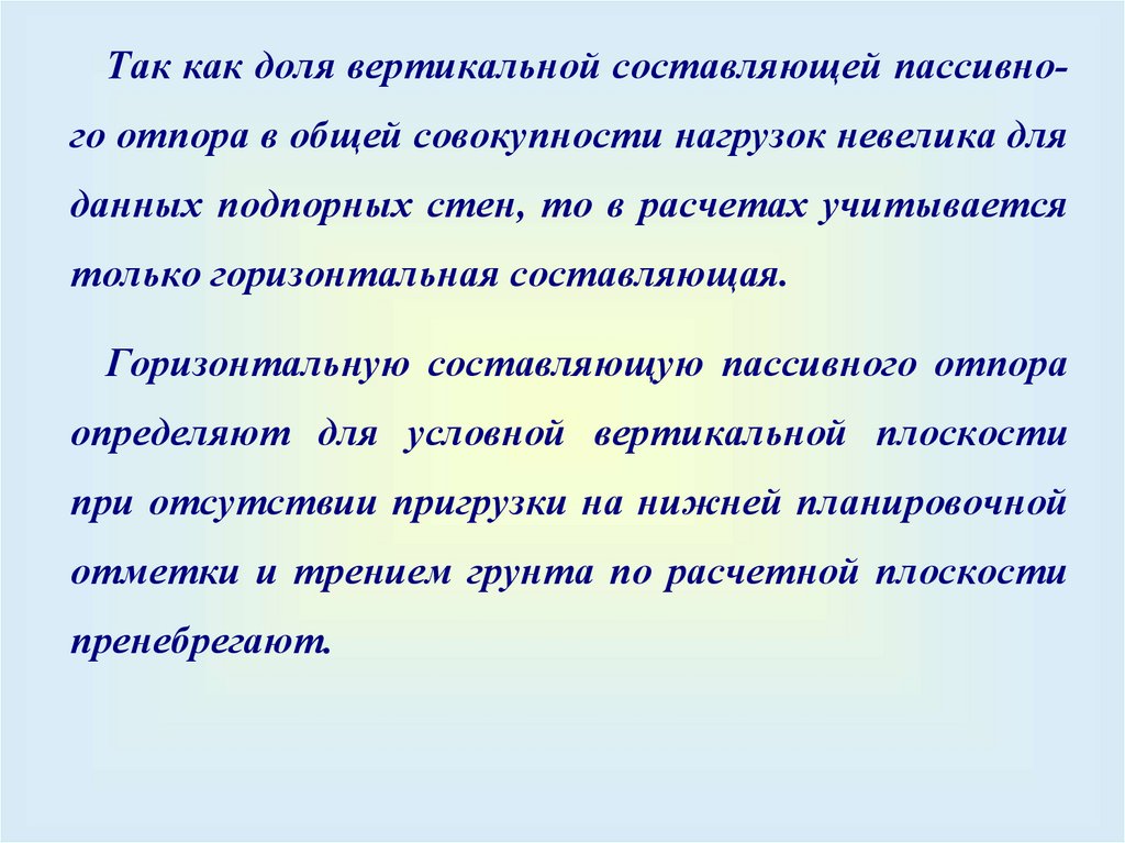 Так как доля вертикальной составляющей пассивного отпора в общей совокупности нагрузок невелика дляданных подпорных стен, то в расчетах учитывается
