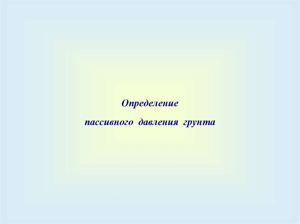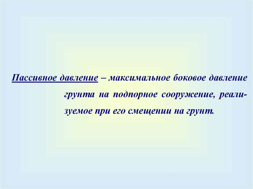Пассивное давление – максимальное боковое давлениегрунта на подпорное сооружение, реализуемое при его смещении на грунт.