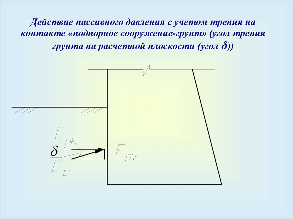 Действие пассивного давления с учетом трения наконтакте «подпорное сооружение-грунт» (угол трения