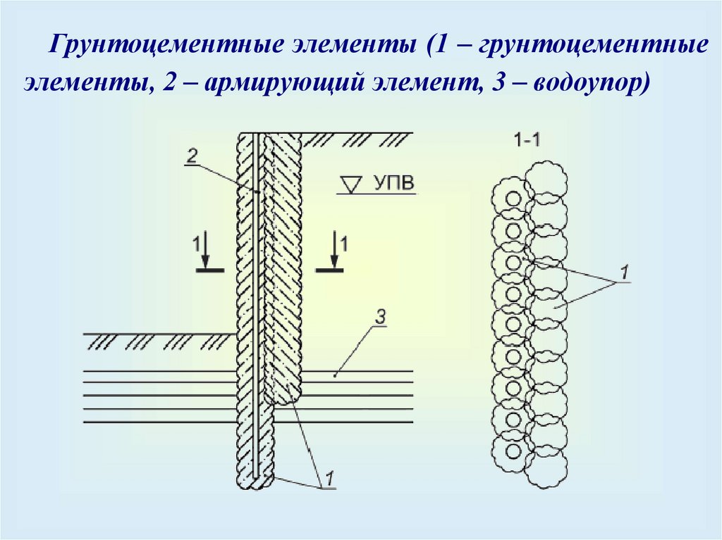Грунтоцементные элементы (1 – грунтоцементныеэлементы, 2 – армирующий элемент, 3 – водоупор)