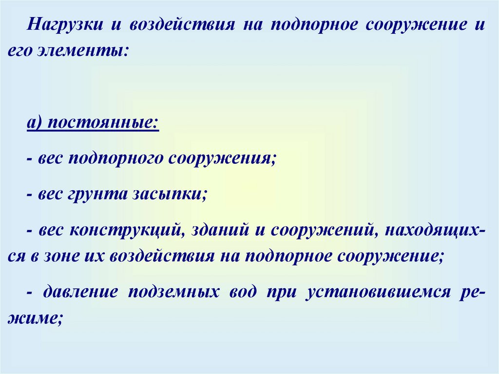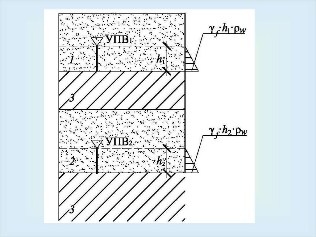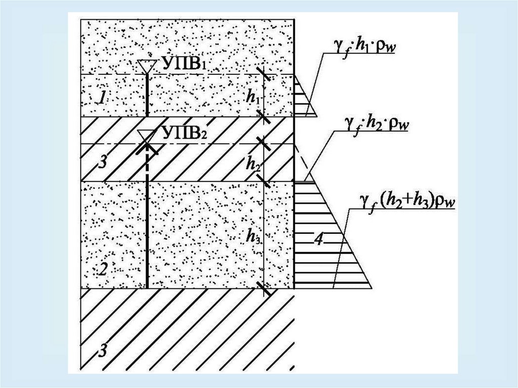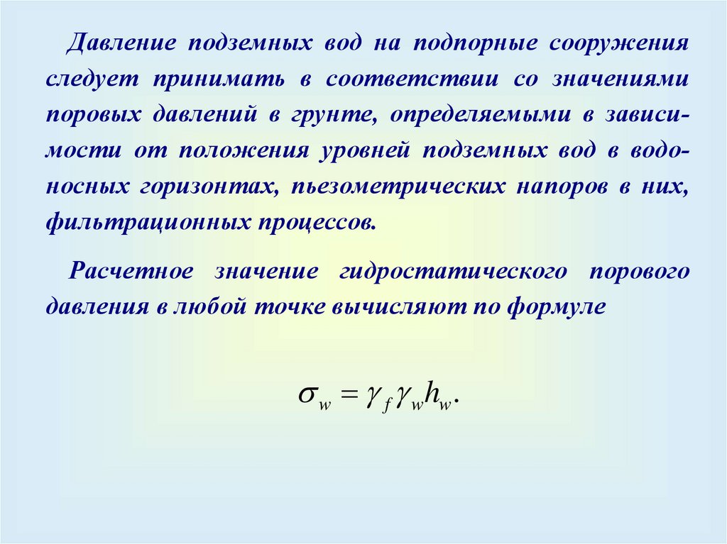 поровых давлений в грунте, определяемыми в зависимости от положения уровней подземных вод в водоносных горизонтах, пьезометрических напоров в них,