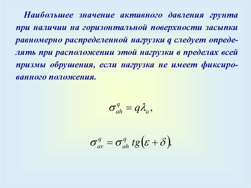 Наибольшее значение активного давления грунтапри наличии на горизонтальной поверхности засыпки