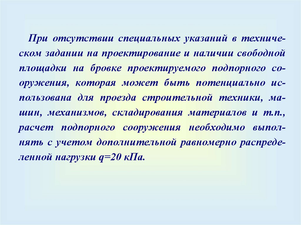 При отсутствии специальных указаний в техническом задании на проектирование и наличии свободнойплощадки на бровке проектируемого подпорного сооружения, которая может быть потенциально использована для проезда строительной техники, машин, механизмов, складирования материалов и т.п.,