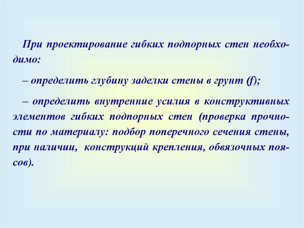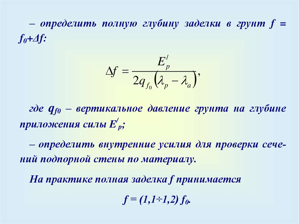 При проектирование гибких подпорных стен необходимо:– определить глубину заделки стены в грунт (f);