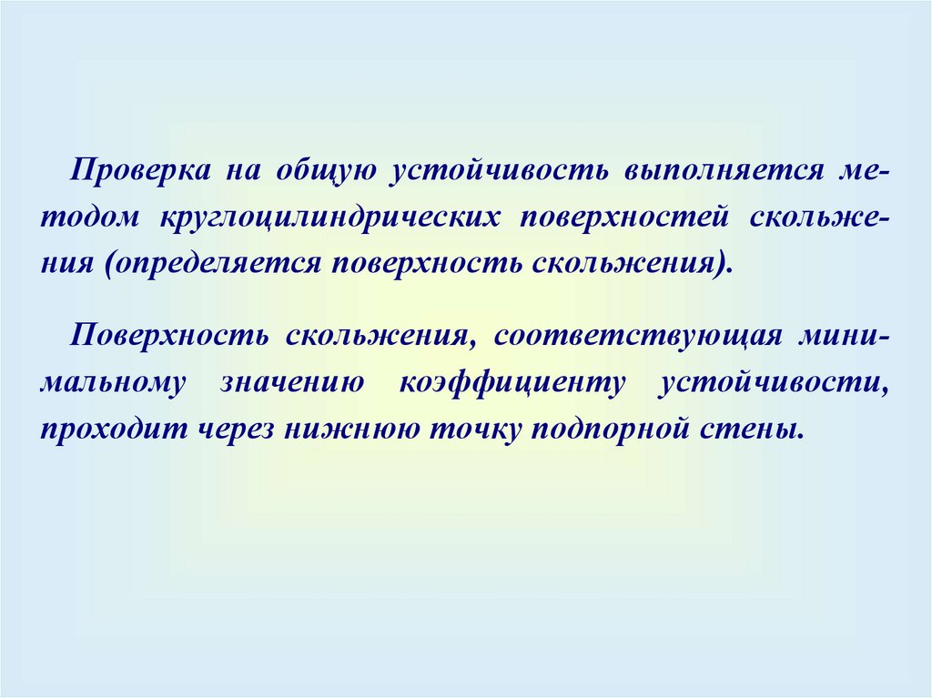 Проверка на общую устойчивость выполняется методом круглоцилиндрических поверхностей скольжения (определяется поверхность скольжения).Поверхность скольжения, соответствующая минимальному значению коэффициенту устойчивости,