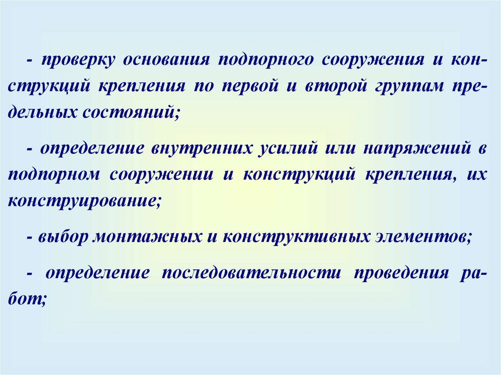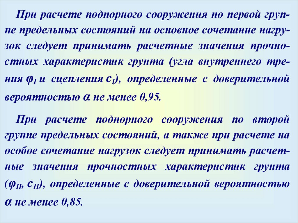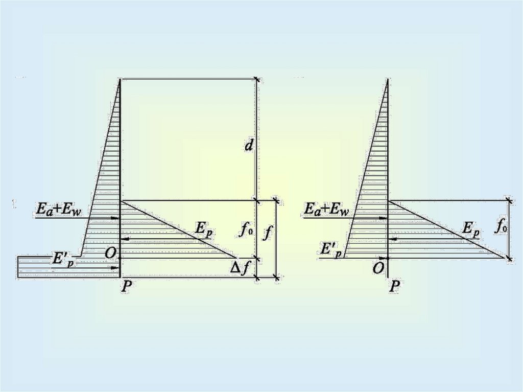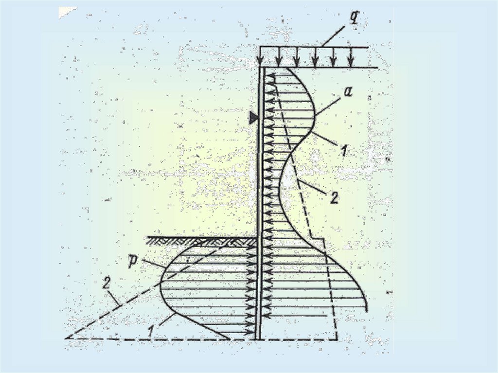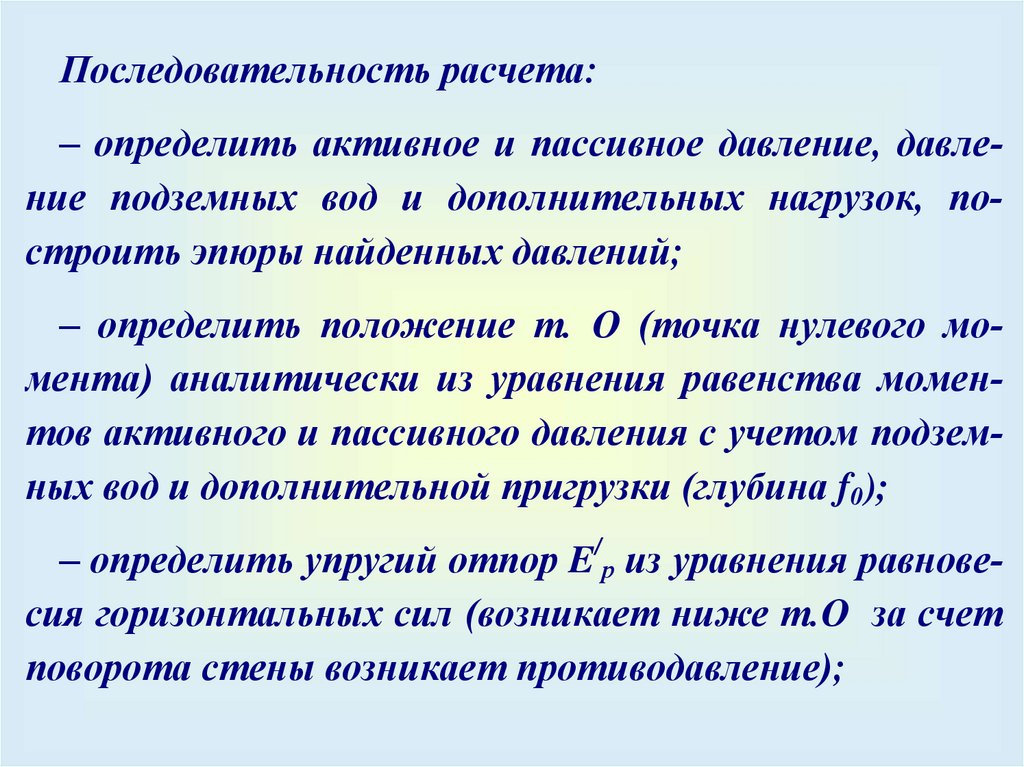 Последовательность расчета:– определить активное и пассивное давление, давление подземных вод и дополнительных нагрузок, построить эпюры найденных давлений;