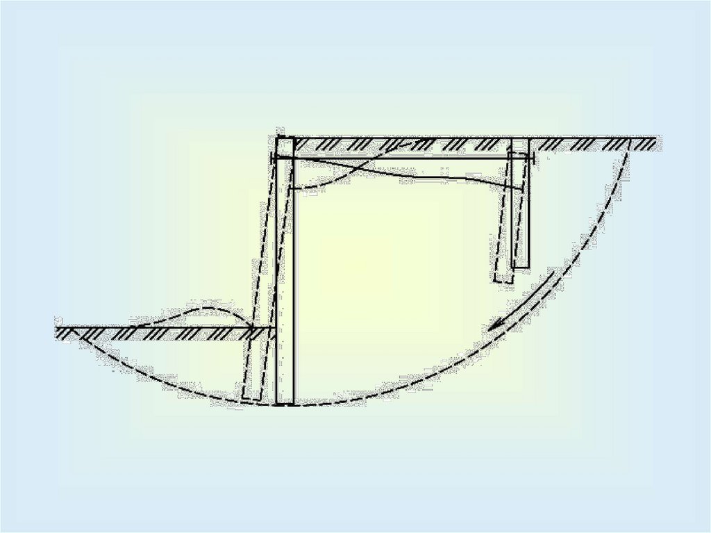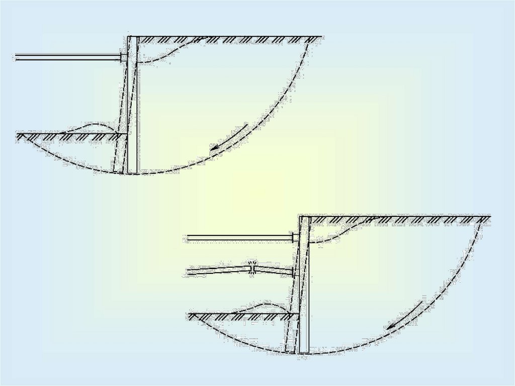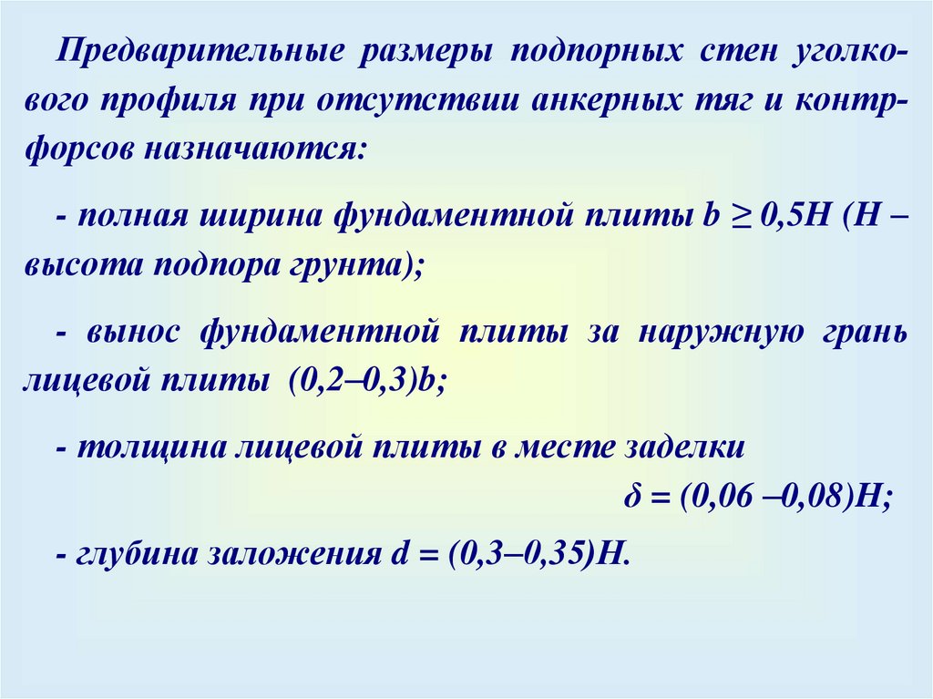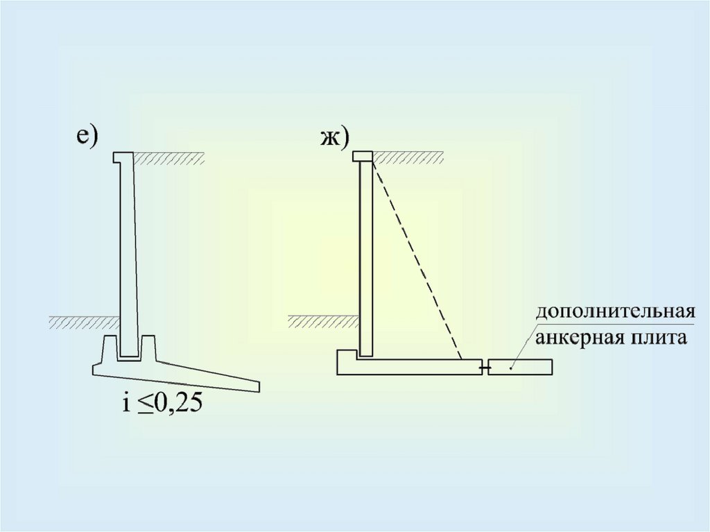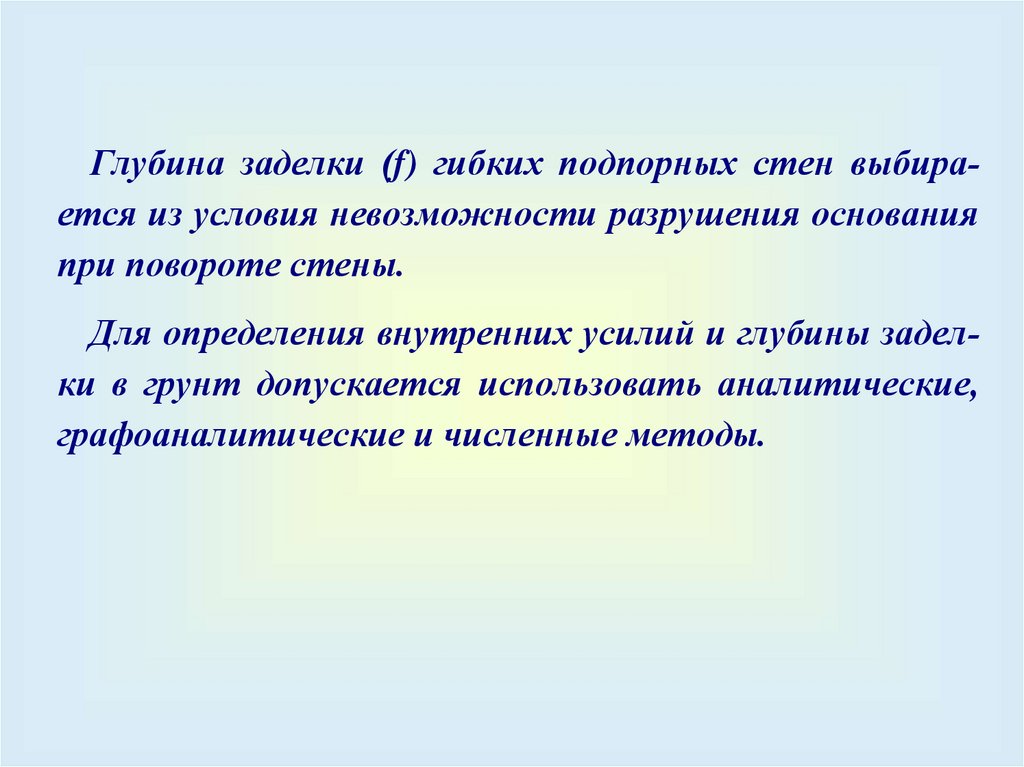 Глубина заделки (f) гибких подпорных стен выбирается из условия невозможности разрушения основанияпри повороте стены.