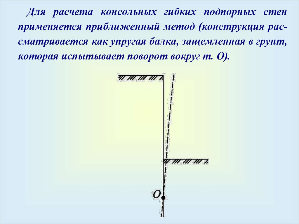 Для расчета консольных гибких подпорных стенприменяется приближенный метод (конструкция рассматривается как упругая балка, защемленная в грунт,