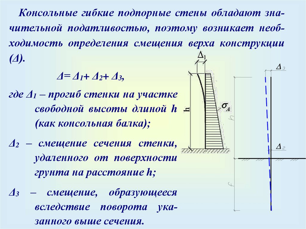 Консольные гибкие подпорные стены обладают значительной податливостью, поэтому возникает необходимость определения смещения верха конструкции(Δ).