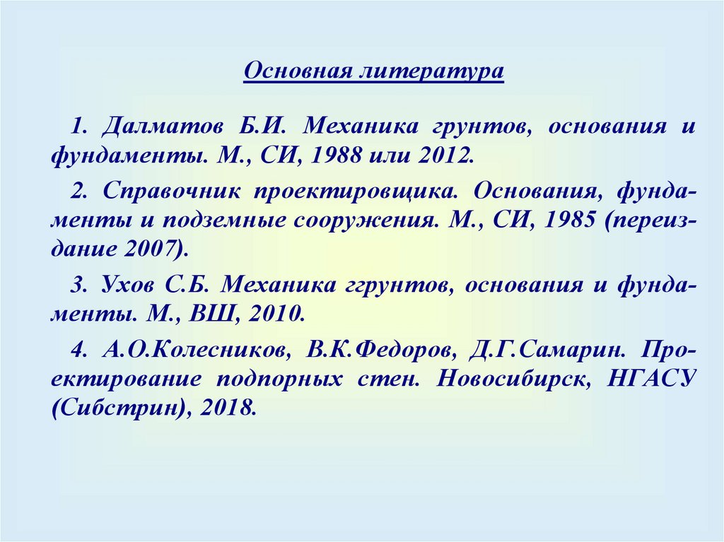Основная литература1. Далматов Б.И. Механика грунтов, основания и