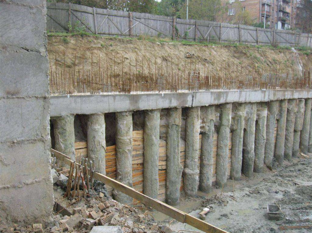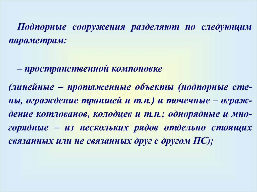 (линейные – протяженные объекты (подпорные стены, ограждение траншей и т.п.) и точечные – ограждение котлованов, колодцев и т.п.; однорядные и многорядные – из нескольких рядов отдельно стоящих