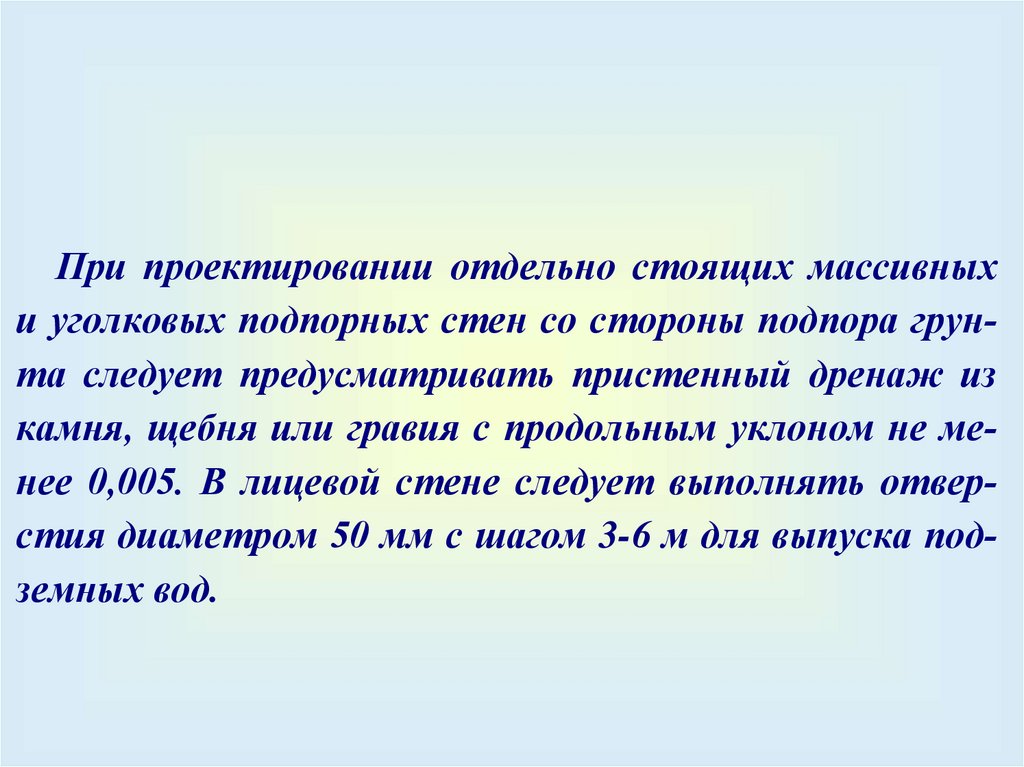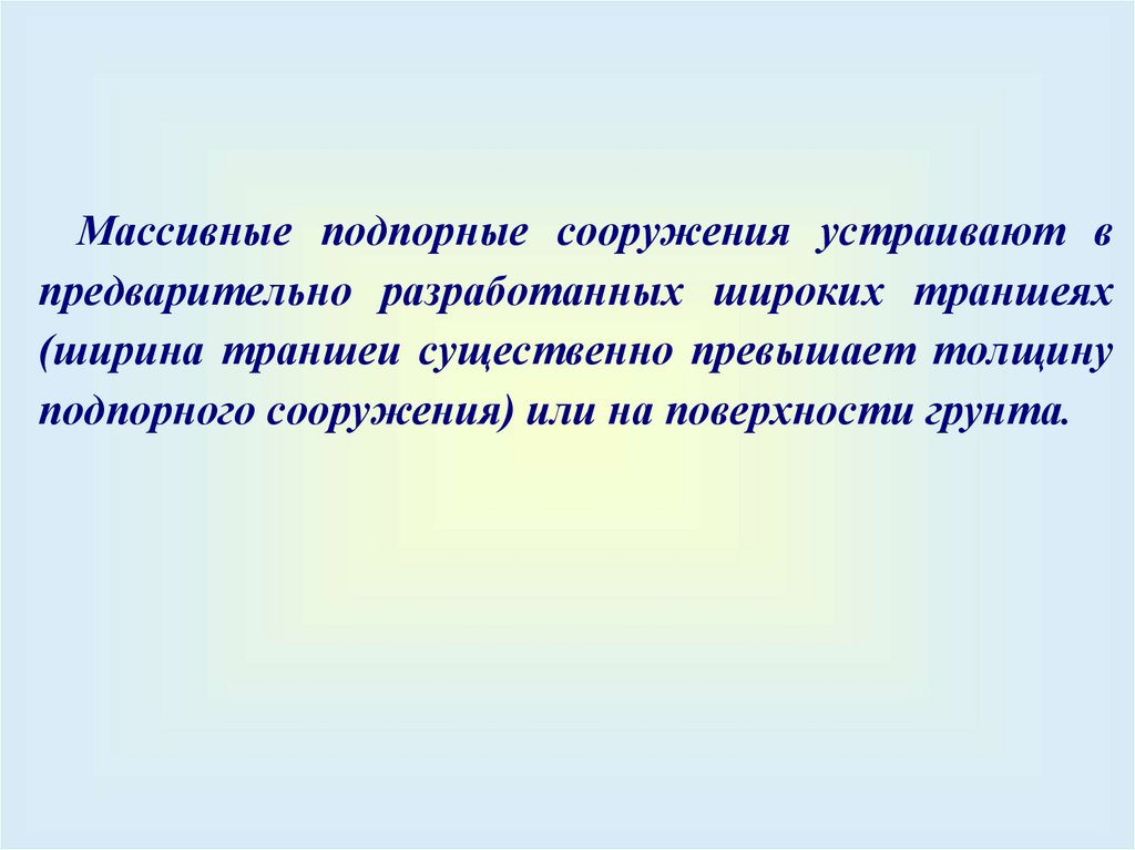 Массивные подпорные сооружения устраивают впредварительно разработанных широких траншеях