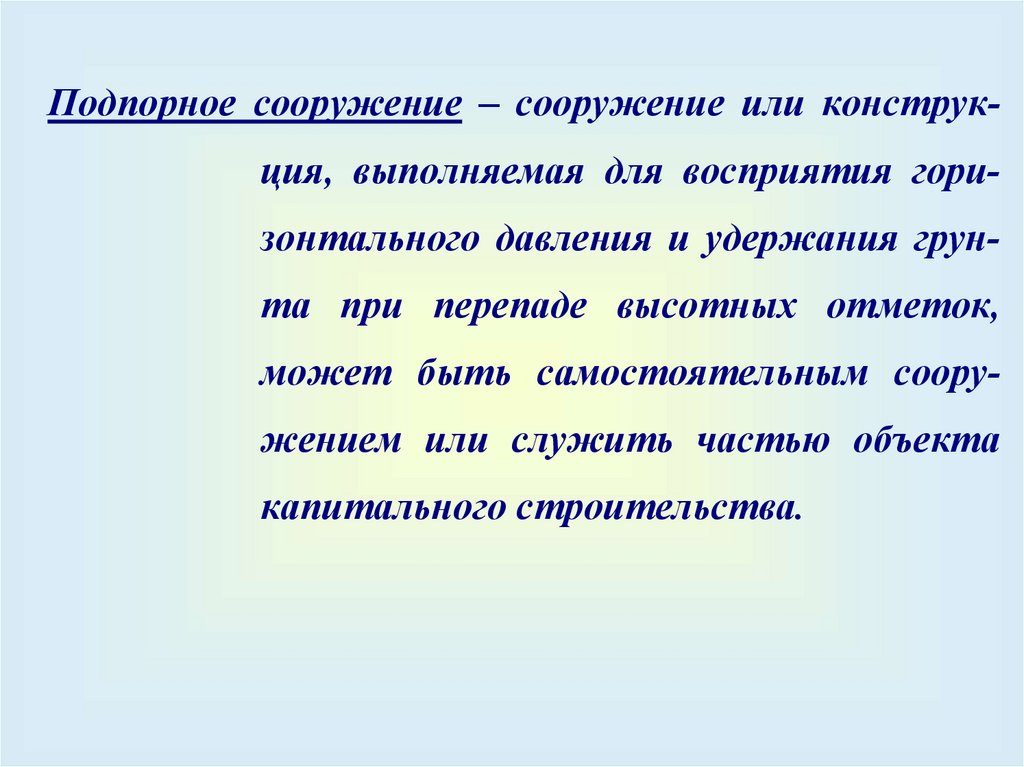 Подпорное сооружение – сооружение или конструкция, выполняемая для восприятия горизонтального давления и удержания грунта при перепаде высотных отметок,может быть самостоятельным сооружением или служить частью объекта