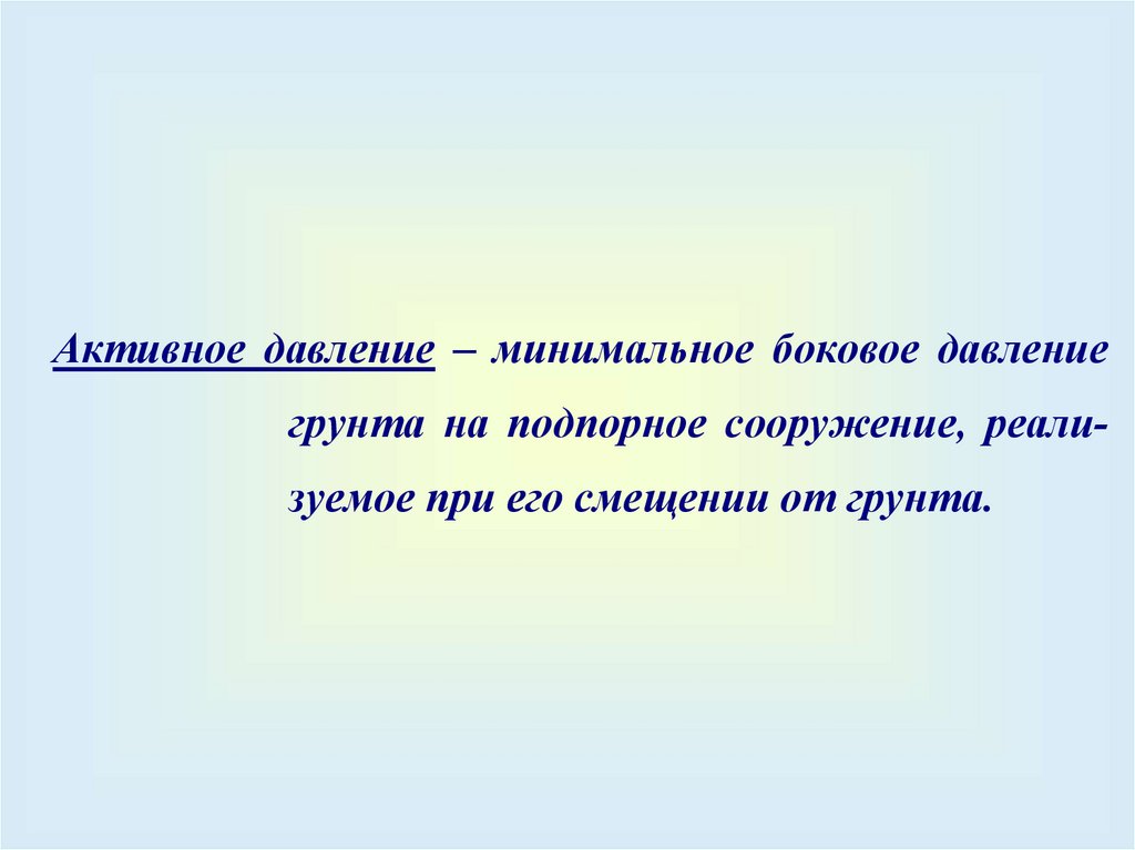 Активное давление – минимальное боковое давлениегрунта на подпорное сооружение, реализуемое при его смещении от грунта.