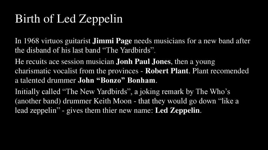 Birth of Led ZeppelinIn 1968 virtuos guitarist Jimmi Page needs musicians for a new band after