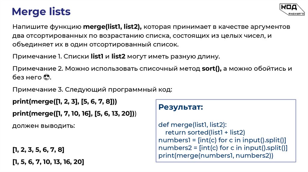 Merge listsНапишите функцию merge(list1, list2), которая принимает в качестве аргументов