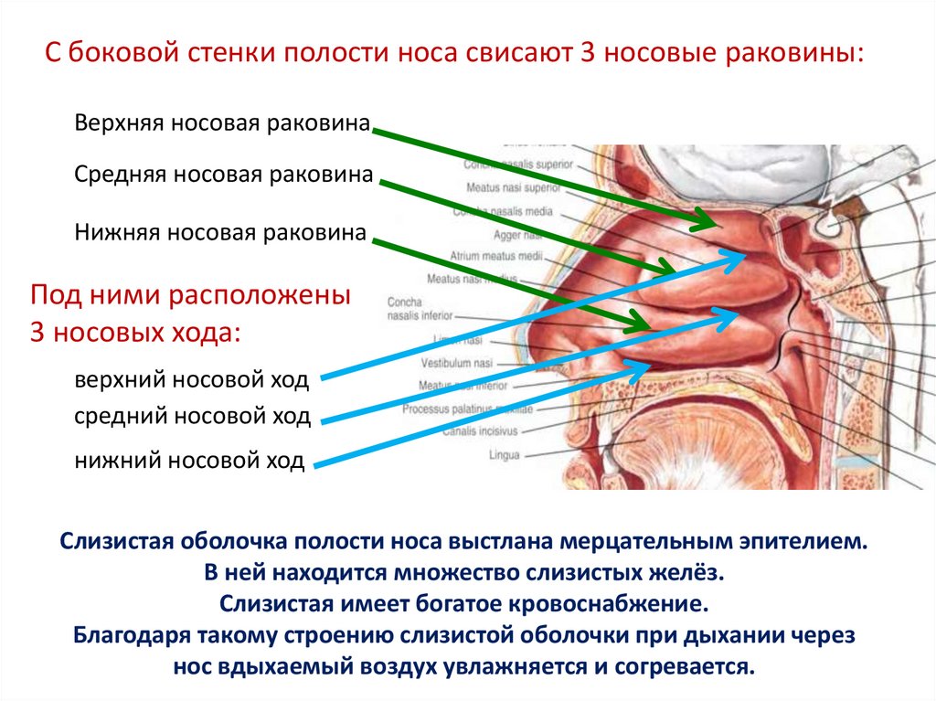 С боковой стенки полости носа свисают 3 носовые раковины:Верхняя носовая раковина