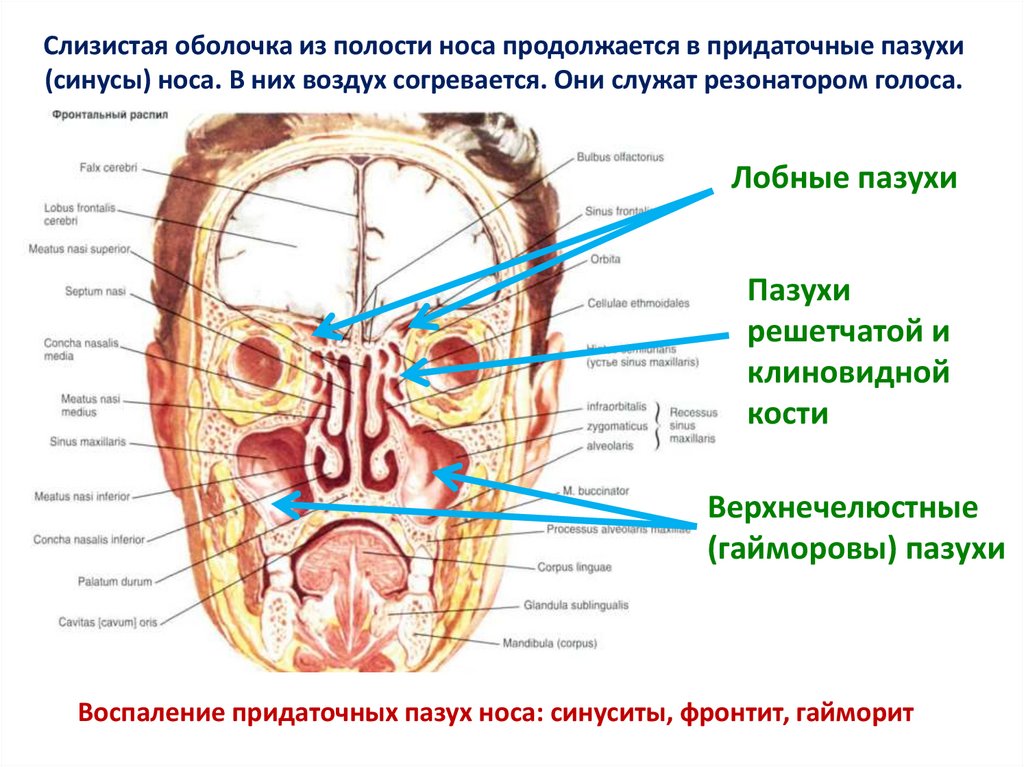 Слизистая оболочка из полости носа продолжается в придаточные пазухи(синусы) носа. В них воздух согревается. Они служат резонатором голоса.