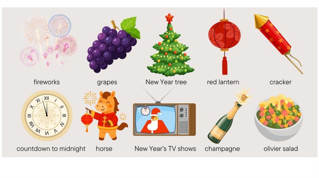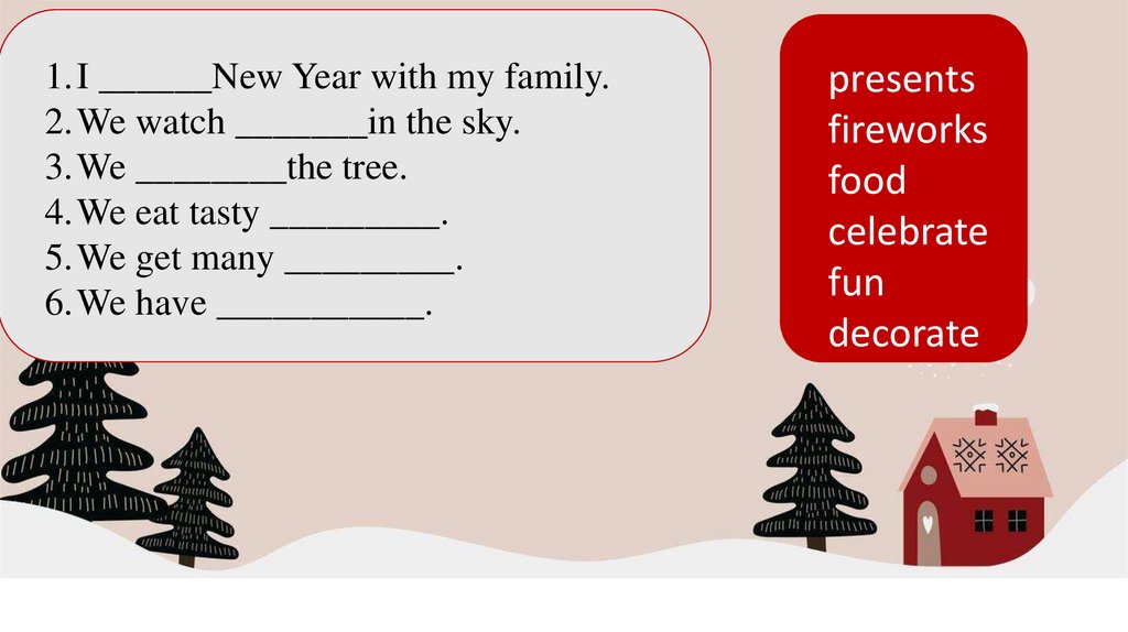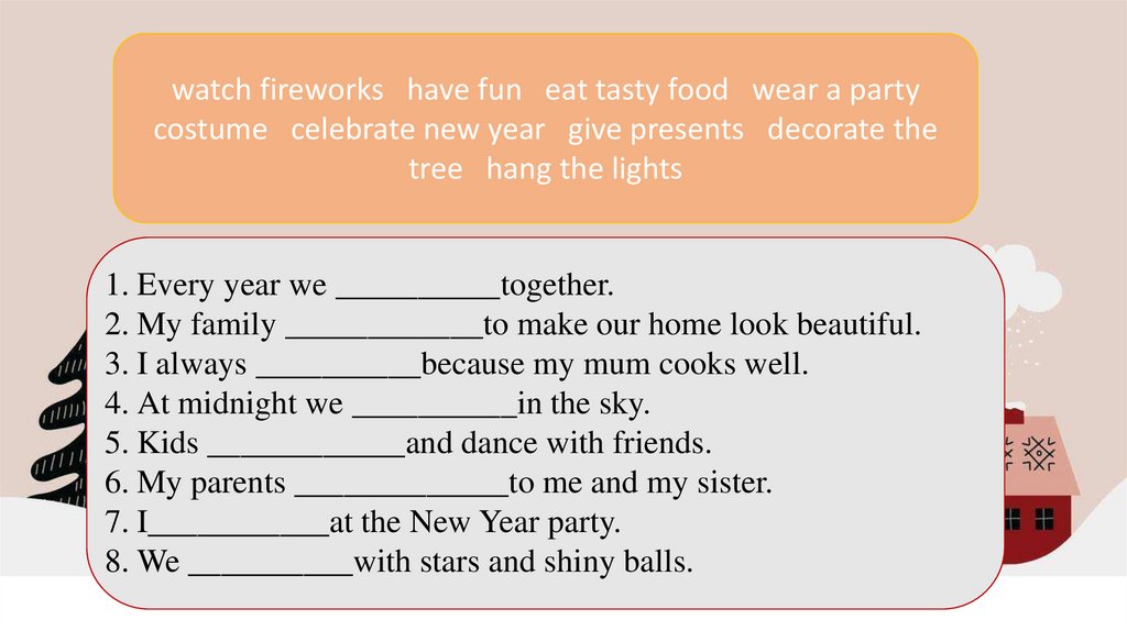 watch fireworks have fun eat tasty food wear a partycostume celebrate new year give presents decorate the