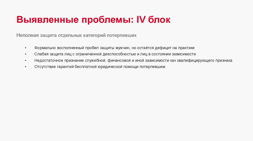 Выявленные проблемы: IV блокНеполная защита отдельных категорий потерпевших