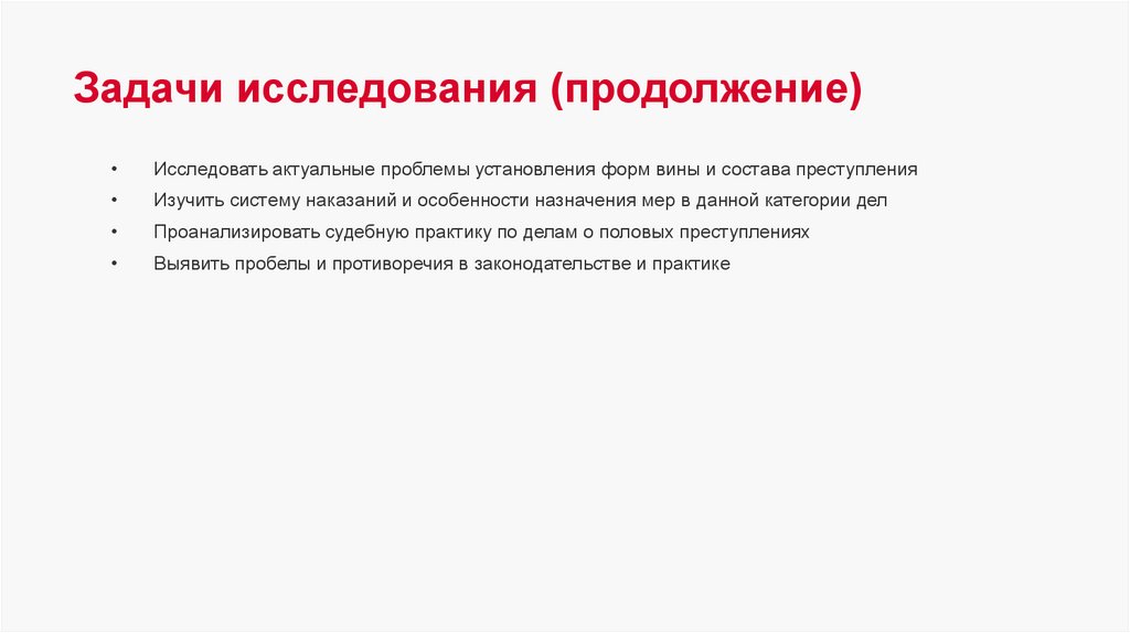 Задачи исследования (продолжение)Исследовать актуальные проблемы установления форм вины и состава преступления