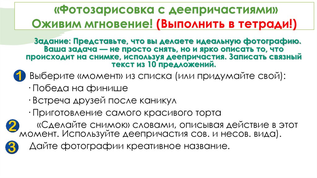 «Фотозарисовка с деепричастиями»Оживим мгновение! (Выполнить в тетради!)
