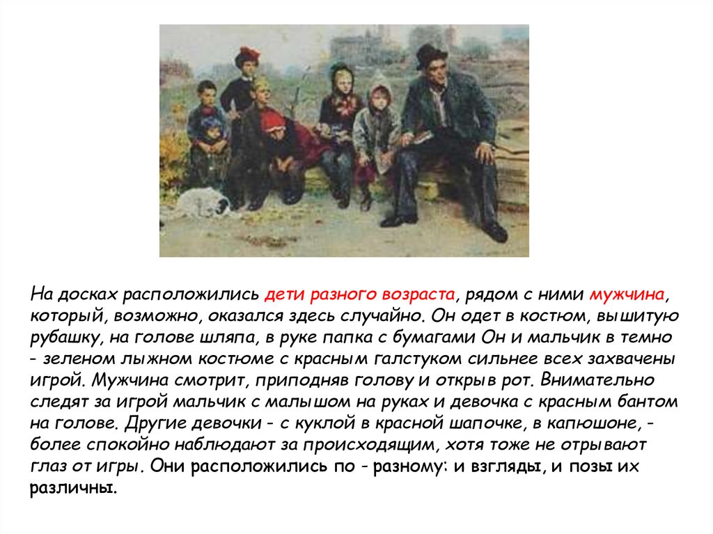 На досках расположились дети разного возраста, рядом с ними мужчина,который, возможно, оказался здесь случайно. Он одет в костюм, вышитую