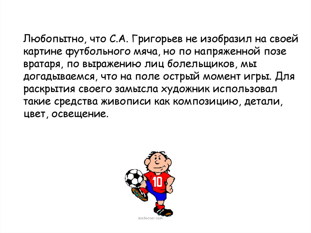 Любопытно, что С.А. Григорьев не изобразил на своейкартине футбольного мяча, но по напряженной позе