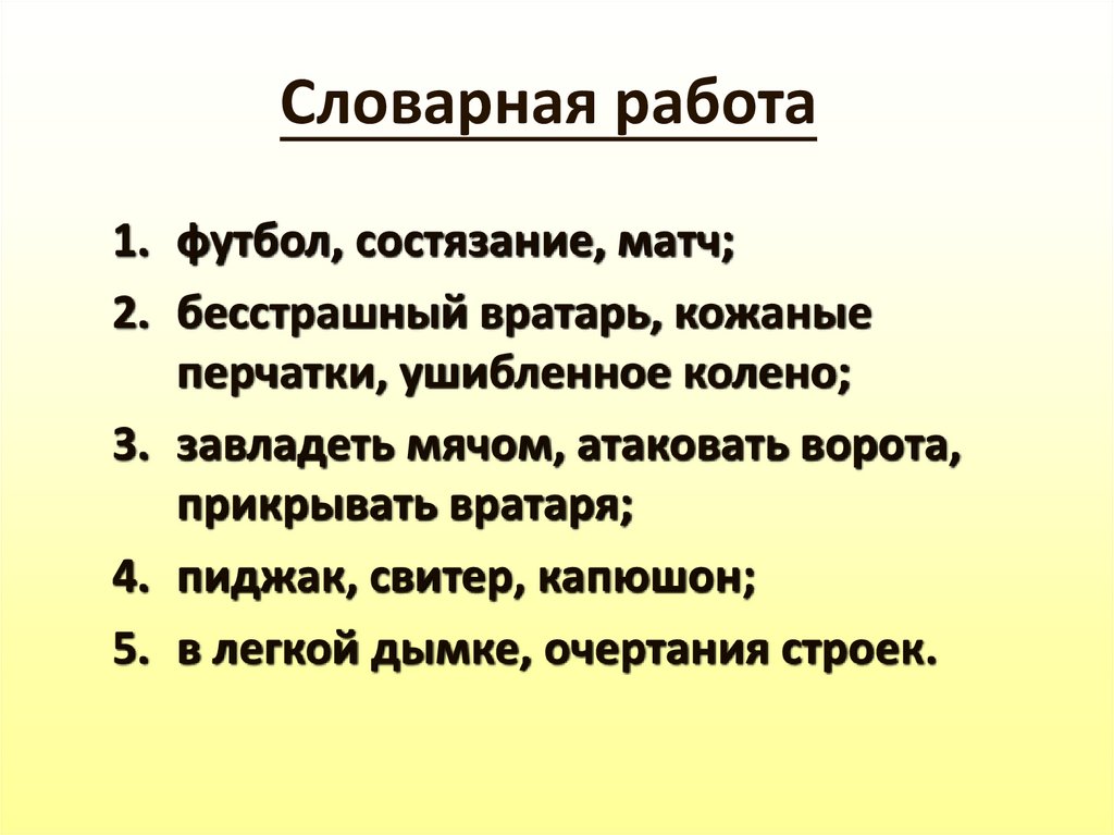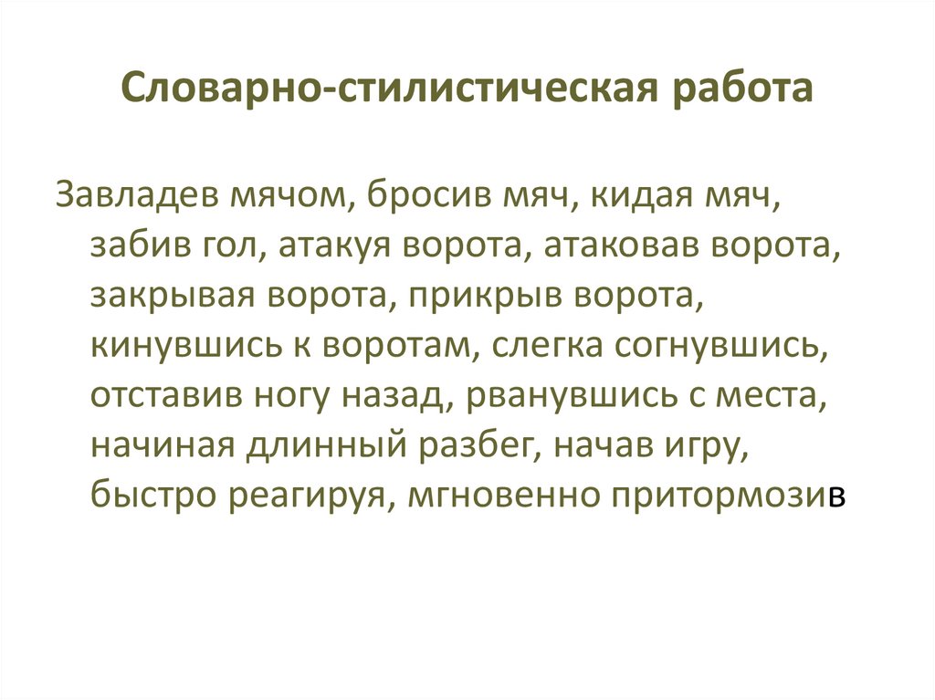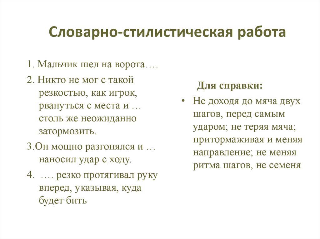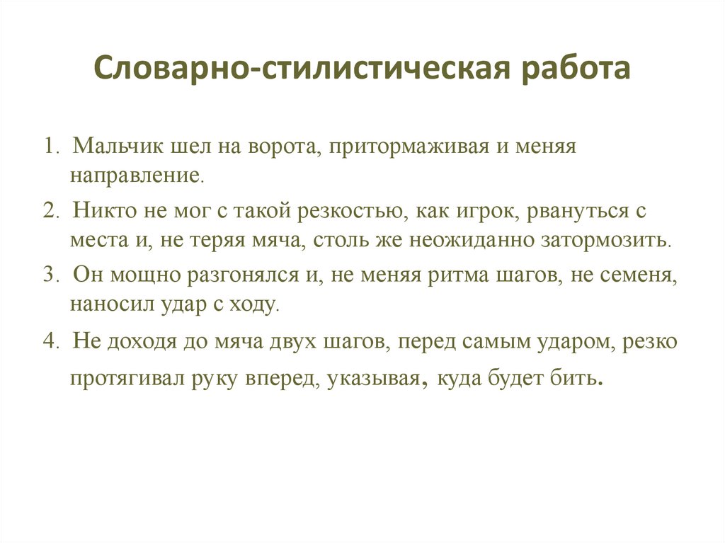 Словарно-стилистическая работа1. Мальчик шел на ворота, притормаживая и меняя