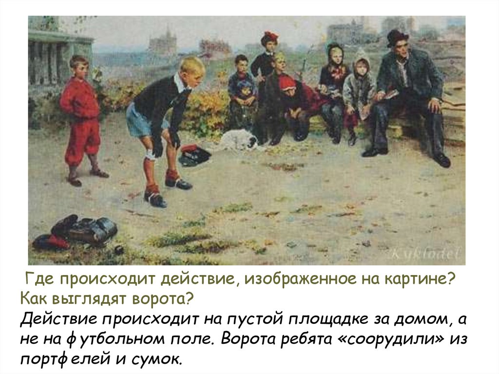 - Рассмотрим, как построена картина. Где - на переднем или на заднем плане изобразил С. А. Григорьев вратаря?На переднем, почти в центре картины. Отдельно от других игроков команды. Он хорошо