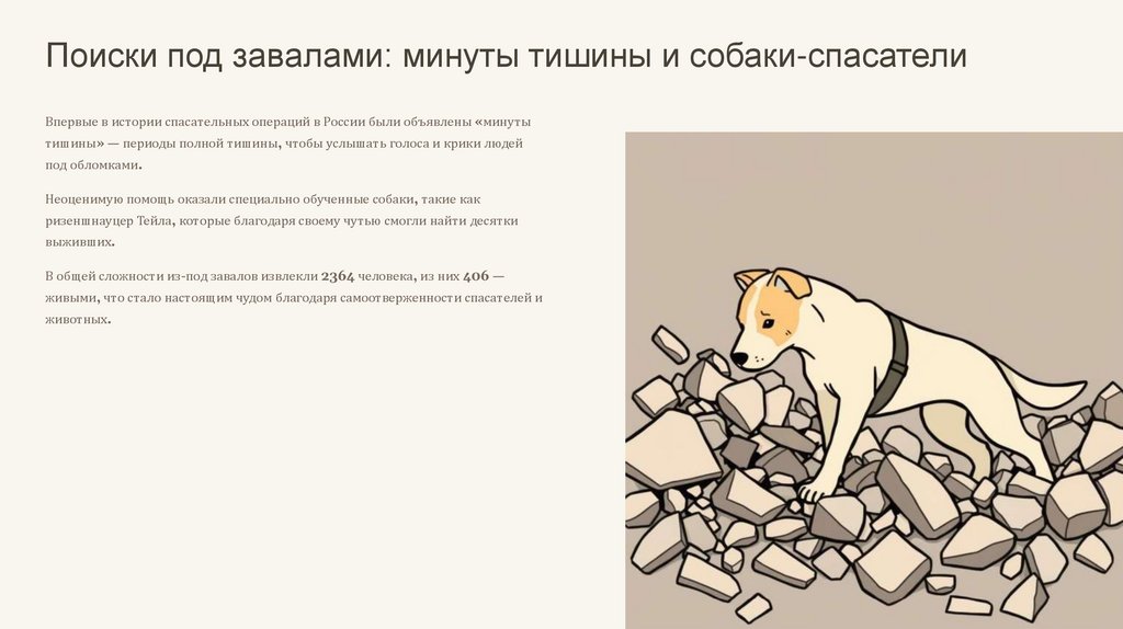 Поиски под завалами: минуты тишины и собаки-спасателиВпервые в истории спасательных операций в России были объявлены «минуты