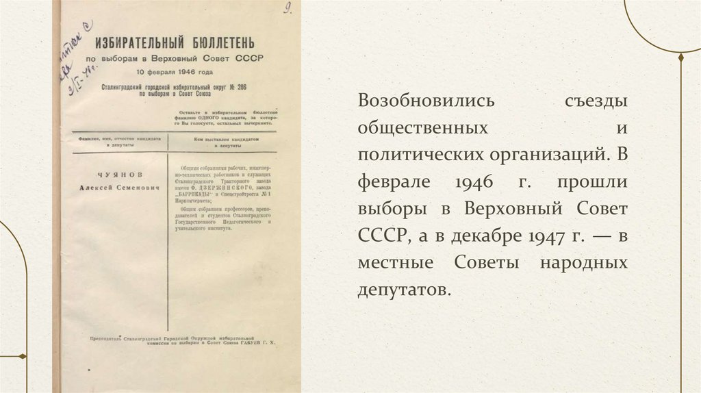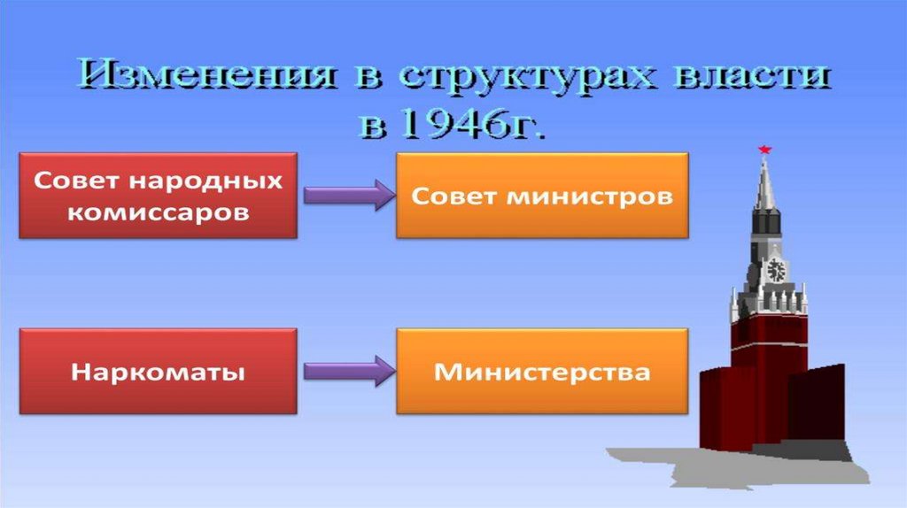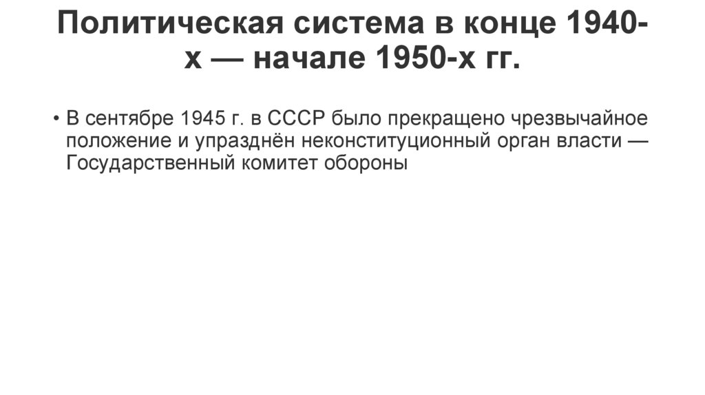 Политическая система в конце 1940х — начале 1950-х гг.• В сентябре 1945 г. в СССР было прекращено чрезвычайное