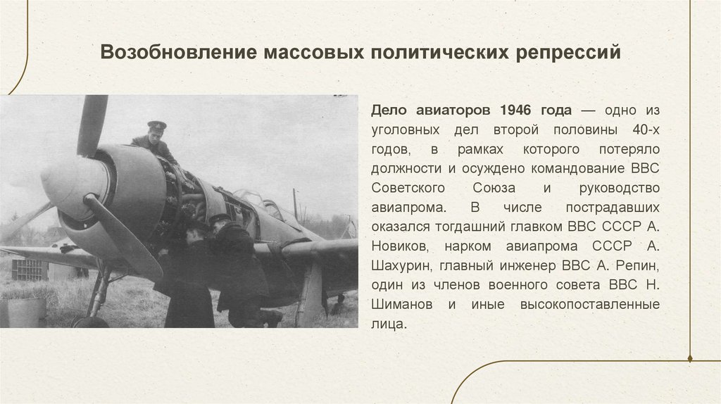 Возобновление массовых политических репрессийДело авиаторов 1946 года — одно из