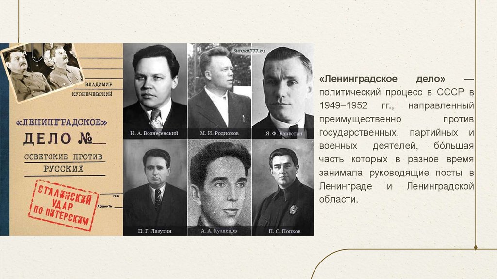 «Ленинградское дело» — политический процесс в СССР в 1949–1952 гг., направленный преимущественно против государственных, партийных и военных деятелей,