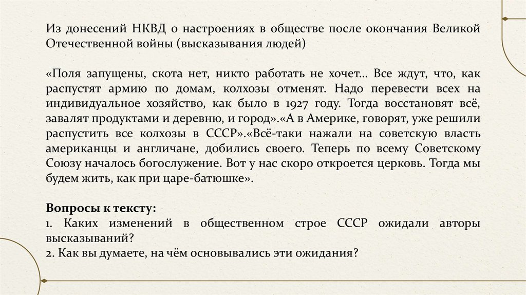 Из донесений НКВД о настроениях в обществе после окончания ВеликойОтечественной войны (высказывания людей)