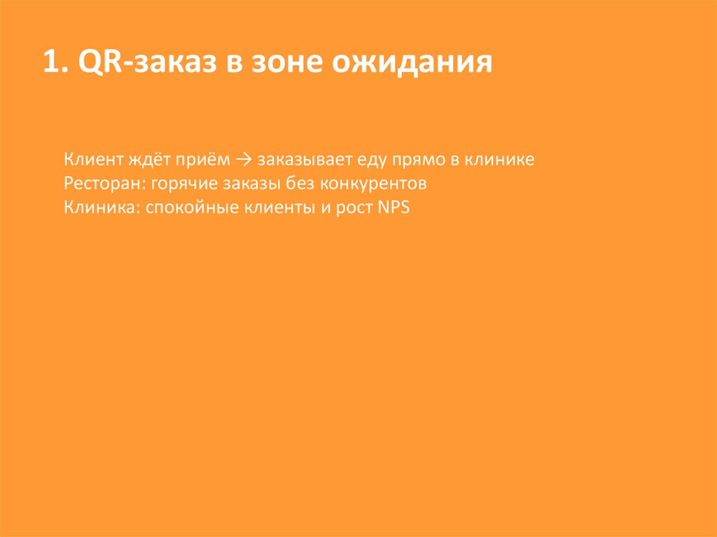 1. QR-заказ в зоне ожиданияКлиент ждёт приём → заказывает еду прямо в клинике
