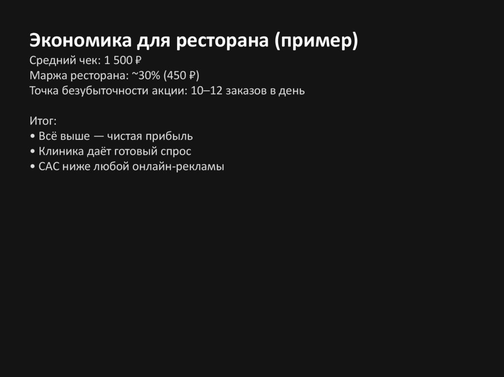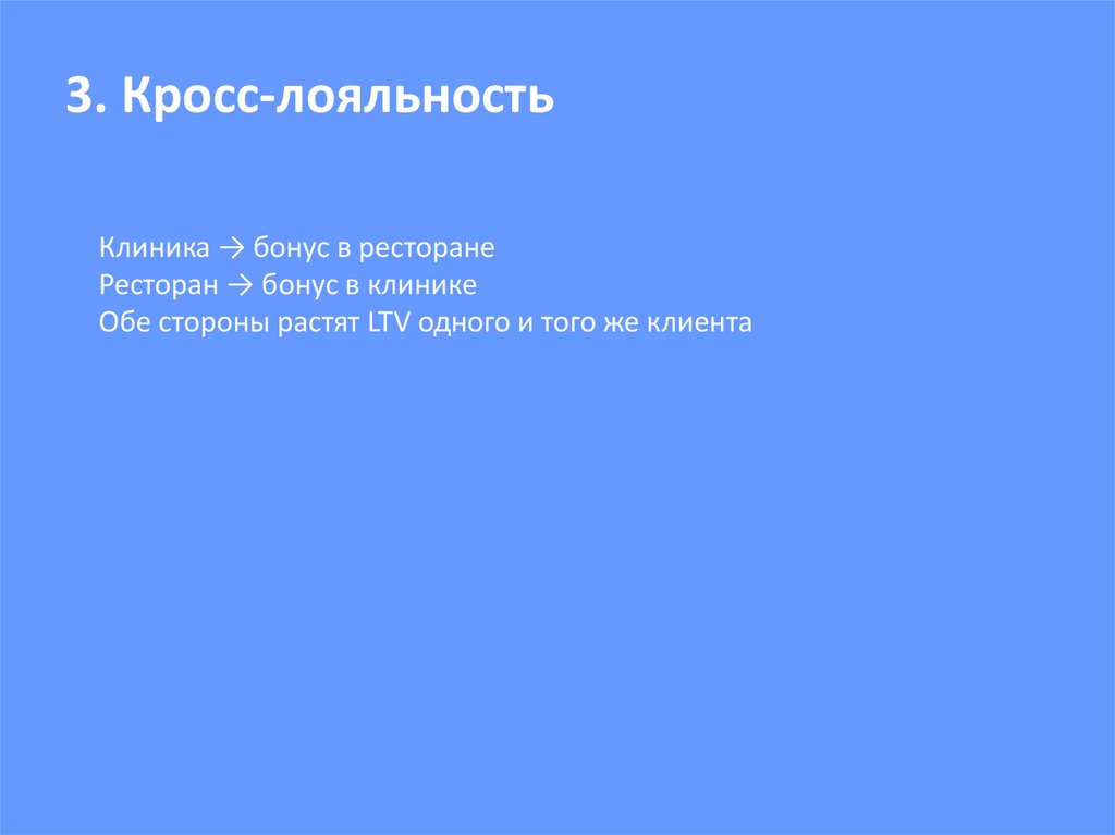 3. Кросс-лояльностьКлиника → бонус в ресторане
