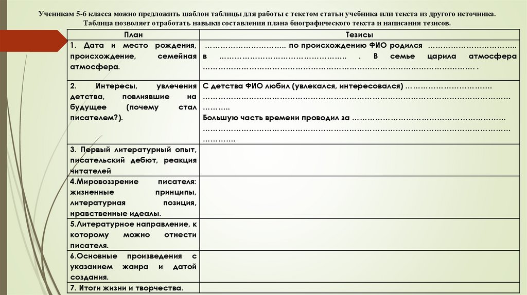 Ученикам 5-6 класса можно предложить шаблон таблицы для работы с текстом статьи учебника или текста из другого источника.Таблица позволяет отработать навыки составления плана биографического текста и написания тезисов.