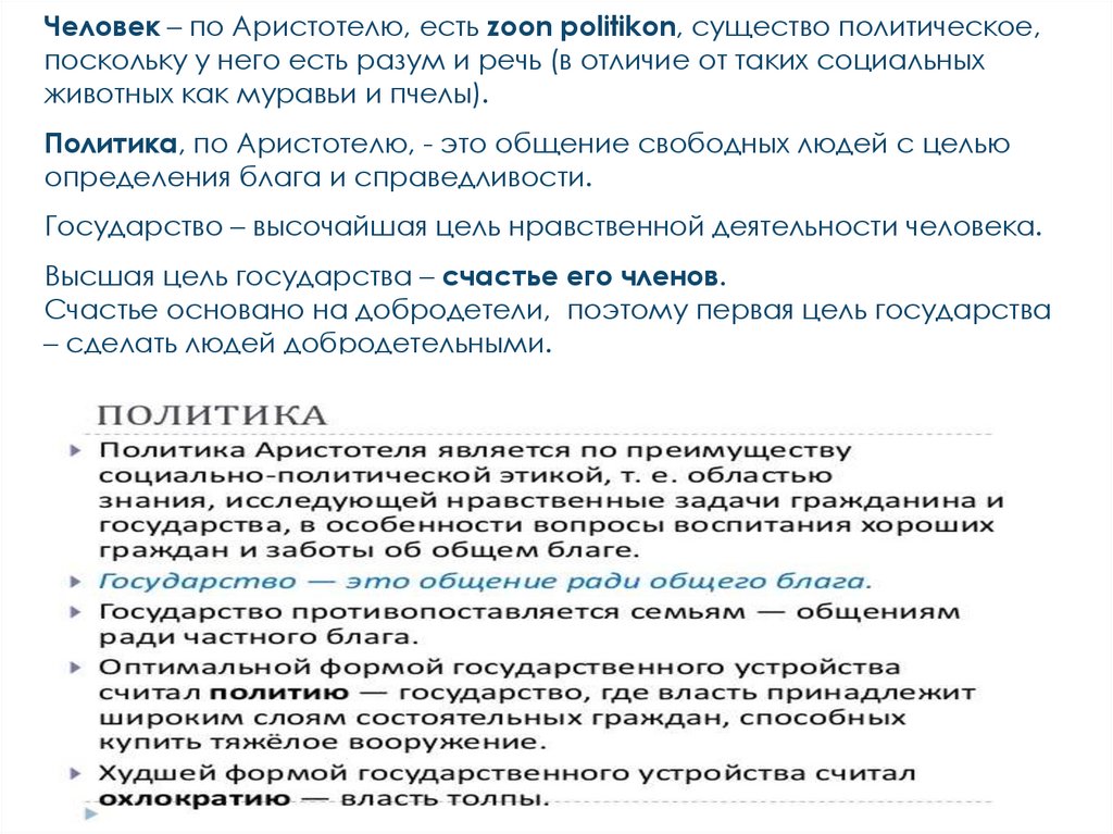 Человек – по Аристотелю, есть zoon politikon, существо политическое,поскольку у него есть разум и речь (в отличие от таких социальных
