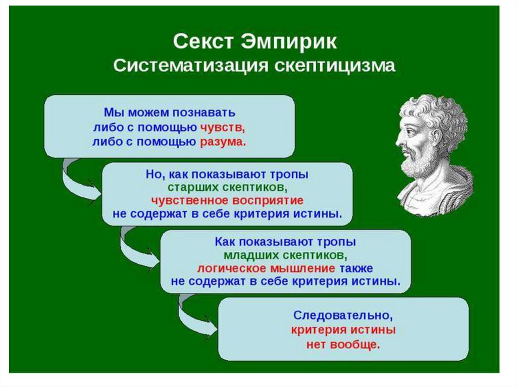 Скептицизм. Пиррон Элидский и Секст Эмпирик.Мир текуч, изменчив, относителен, непостоянен.