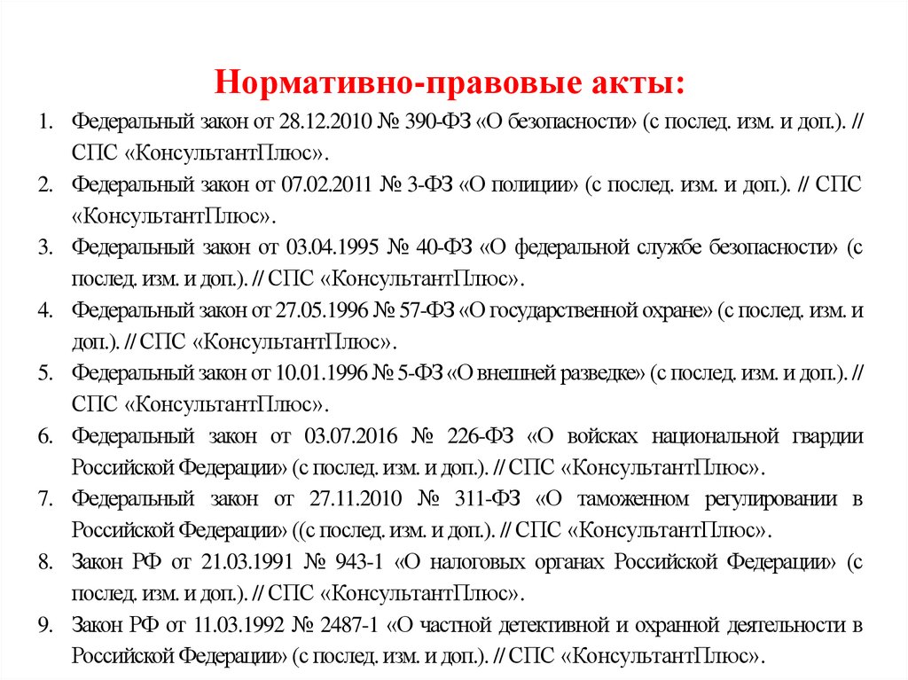 Нормативно-правовые акты:1. Федеральный закон от 28.12.2010 № 390-ФЗ «О безопасности» (с послед. изм. и доп.). //