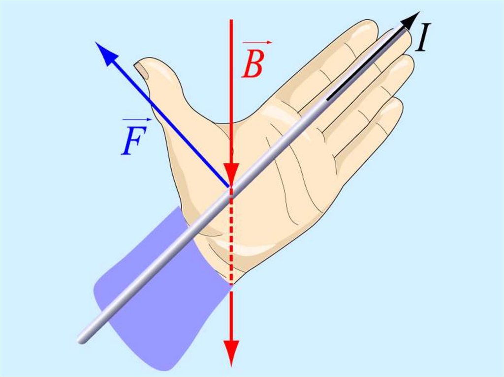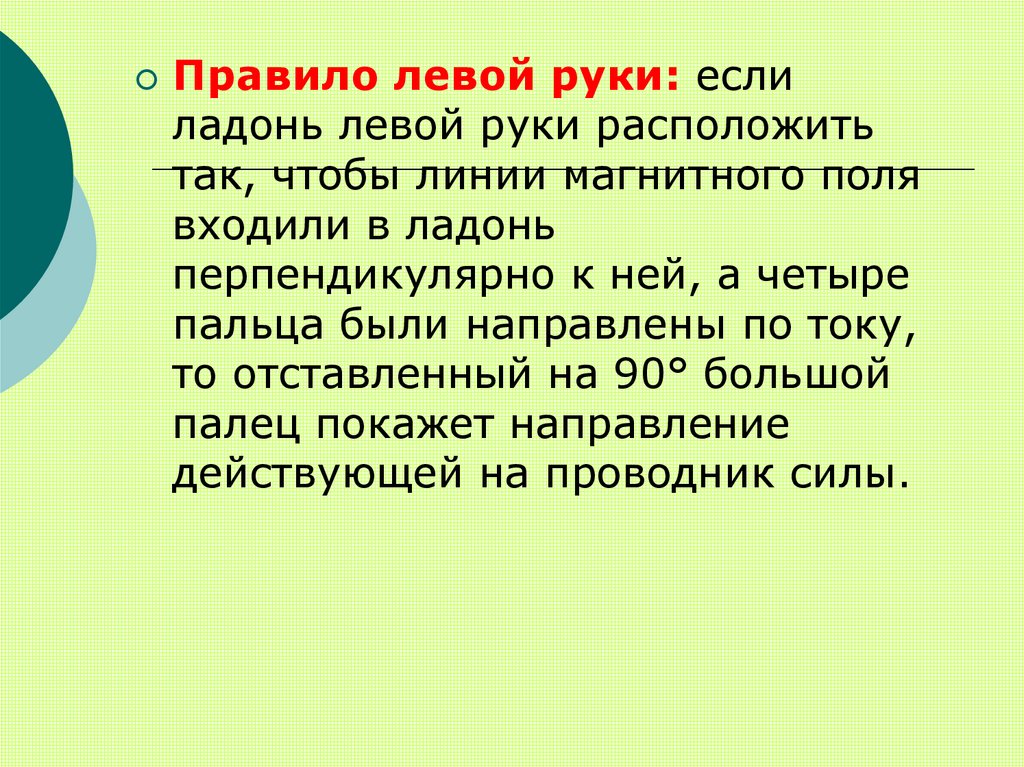 16. Если левую руку расположить так, чтобы магнитные силовые линии входили в ладонь, четыре пальца, сложенные вместе, показывали