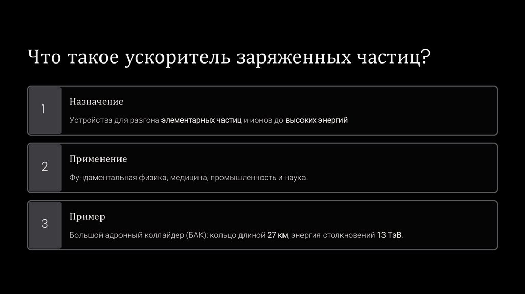 Большой адронный коллайдер (БАК): кольцо длиной 27 км, энергия столкновений 13 ТэВ.